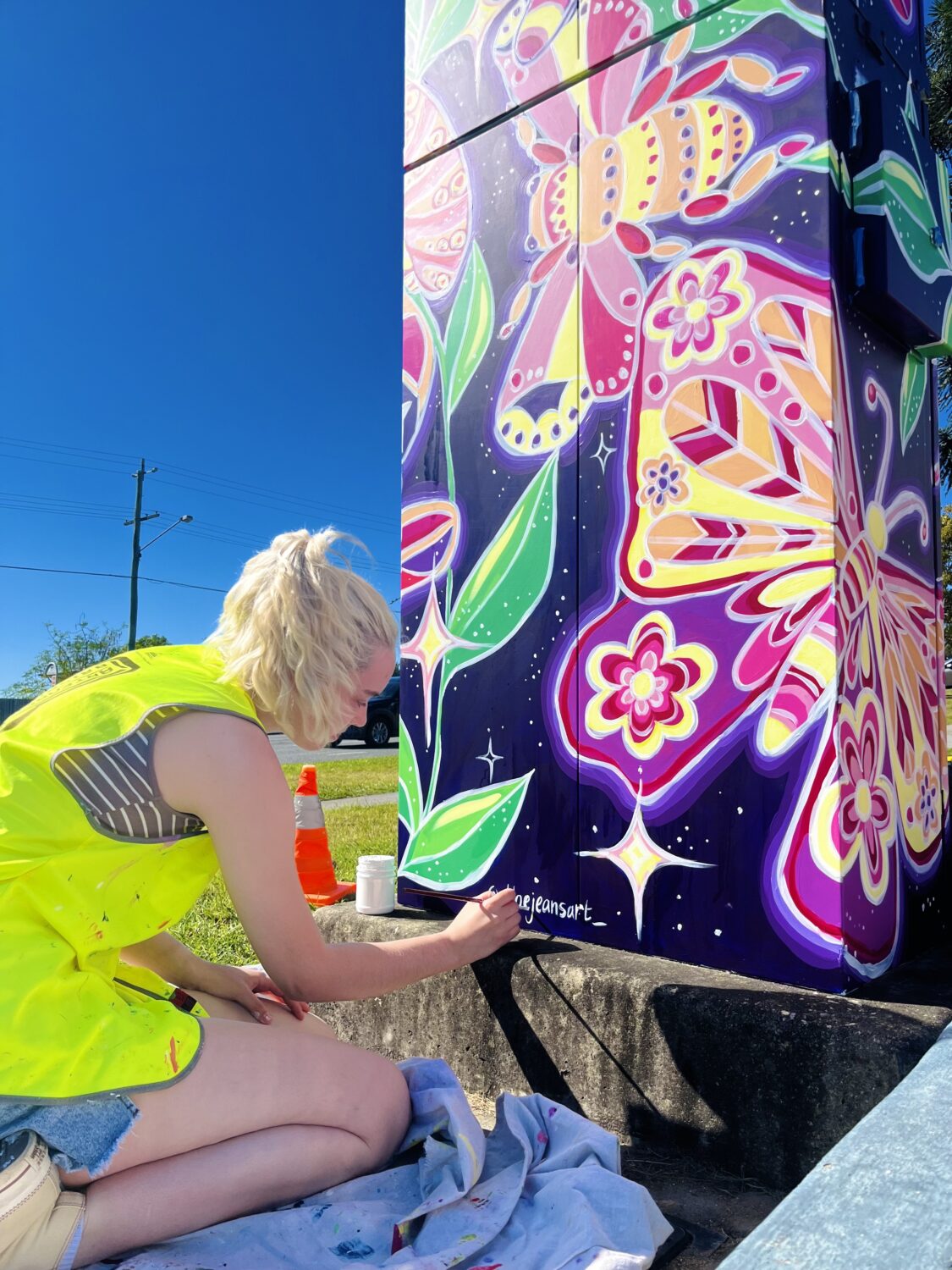 Inspired by her love of the natural world, Chloe’s design features whimsical critters brought to life in bold, bright tones which is a playful contrast to the grey roads and urban surroundings.